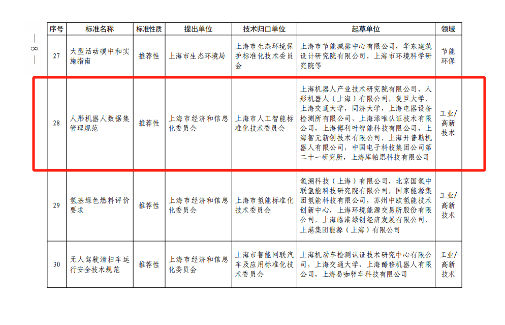 该标准由上海市人工智能标准化技术委员会归口,提出单位为上海市经济和信息化委员会,起草单位由米兰国际足球赛官网有限公司,人形机器人(上海)有限公司等。