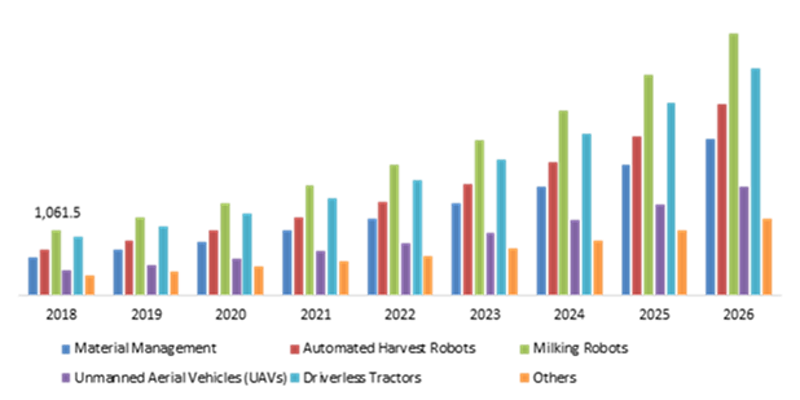 乳品管理是农业中最常用的机器人应用。乳品管理机器人业务在 2018 年的收入为 11.46 亿美元,到 2026 年将达到 44.929 亿美元。在乳业管理中,先进的机器人用于从奶牛身上取奶,也可以用于畜牧。