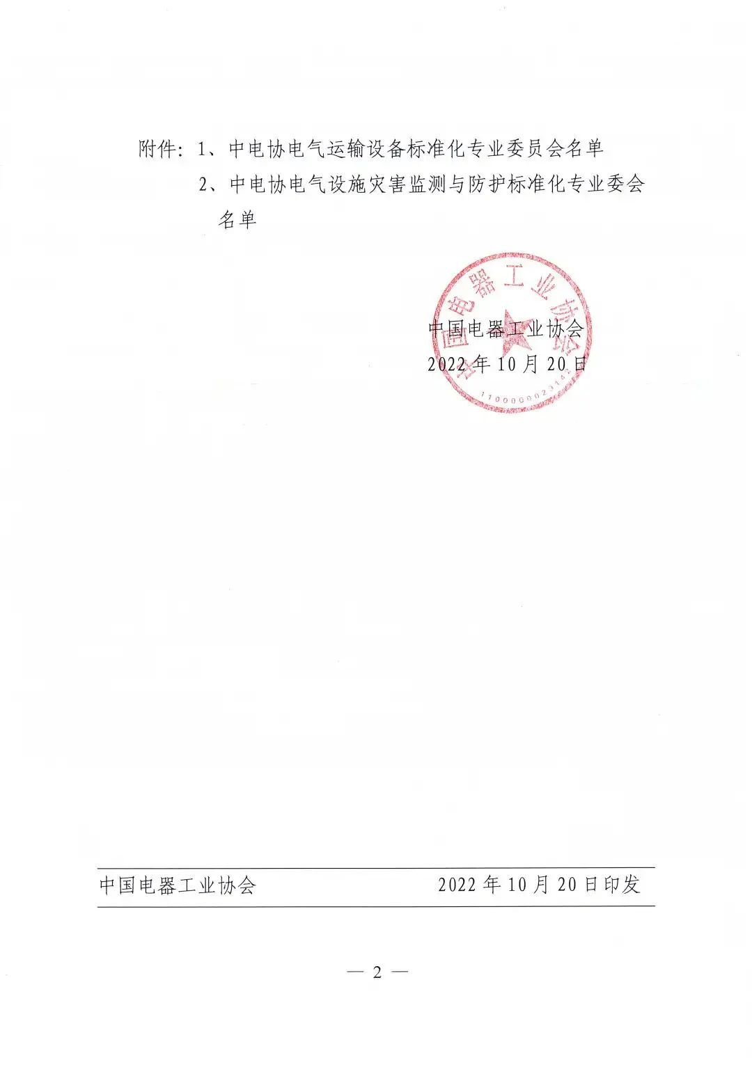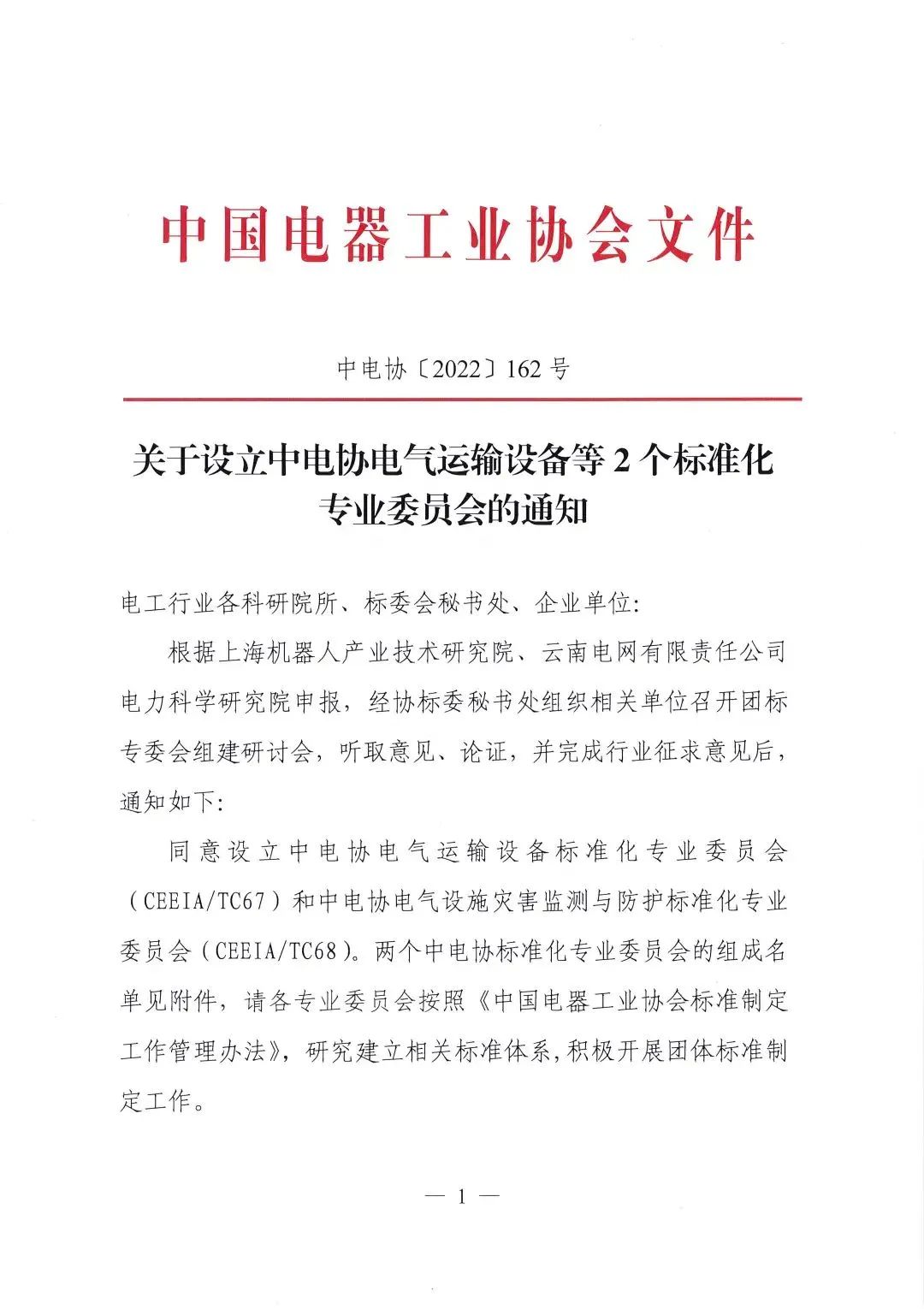 2022年10月20日,中电协[2022]162号文件下达了《关于设立中电协电气运输设备等2个标准化专业委员会的通知》,同意设立中电协电气运输设备标准化专业委员会(CEEIA/ TC67),秘书处挂靠单位为米兰国际足球赛官网。
